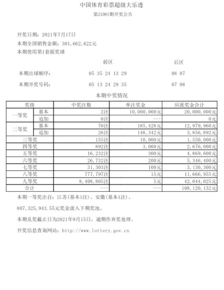 本期全国共开出2注一等奖,单注奖金为1000万元,分落江苏南通、安徽芜湖。