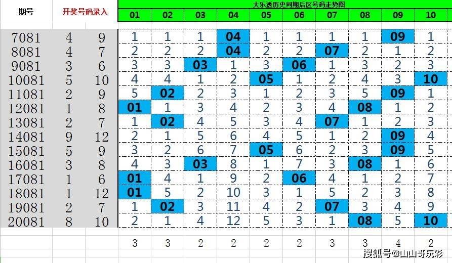 后区号码,上期开了0奇0质2大。本期可能会开1-2个奇数,1-2个质数,1-2个大号。根据经验选出的后区号码是:01,04,05,08。