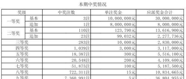 本期一等奖中出3注,单注奖金1000万元,其中追加1注,单注追加总奖金1800万元;二等奖中出110注,单注奖金12.3万元,其中追加23注,单注追加总奖金22.2万元。