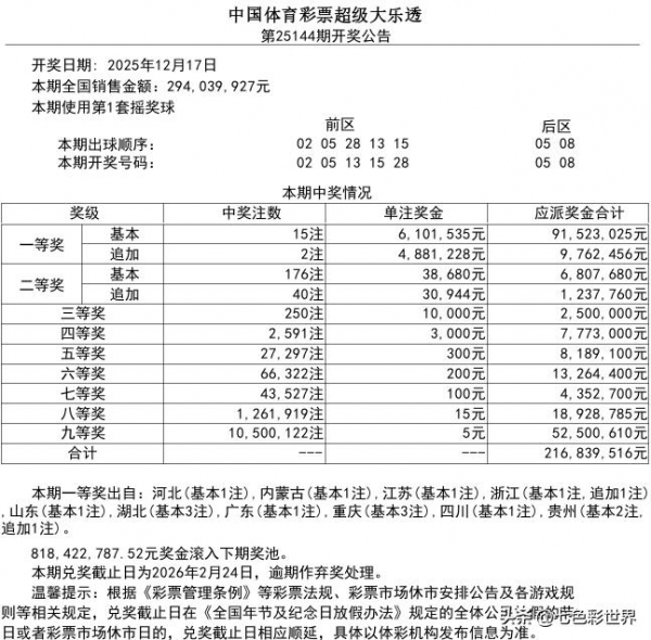 计奖后8.18亿元奖金滚入下期奖池;本期兑奖截止日为2026年2月24日,逾期作弃奖处理。