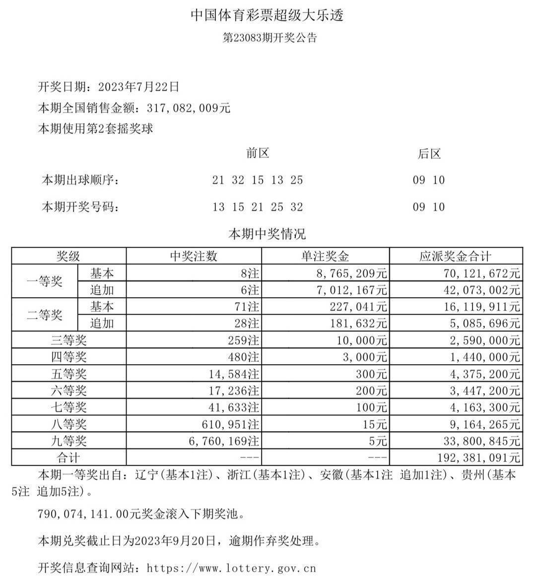 中国体育彩票超级大乐透第23083期全国销售金额317082009元。开奖号码:13 15 21 25 32。返回搜狐,查看更多