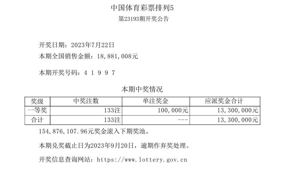 中国体育彩票排列5第23193期全国销售金额18881008元。开奖号码:4 1 9 9 7。