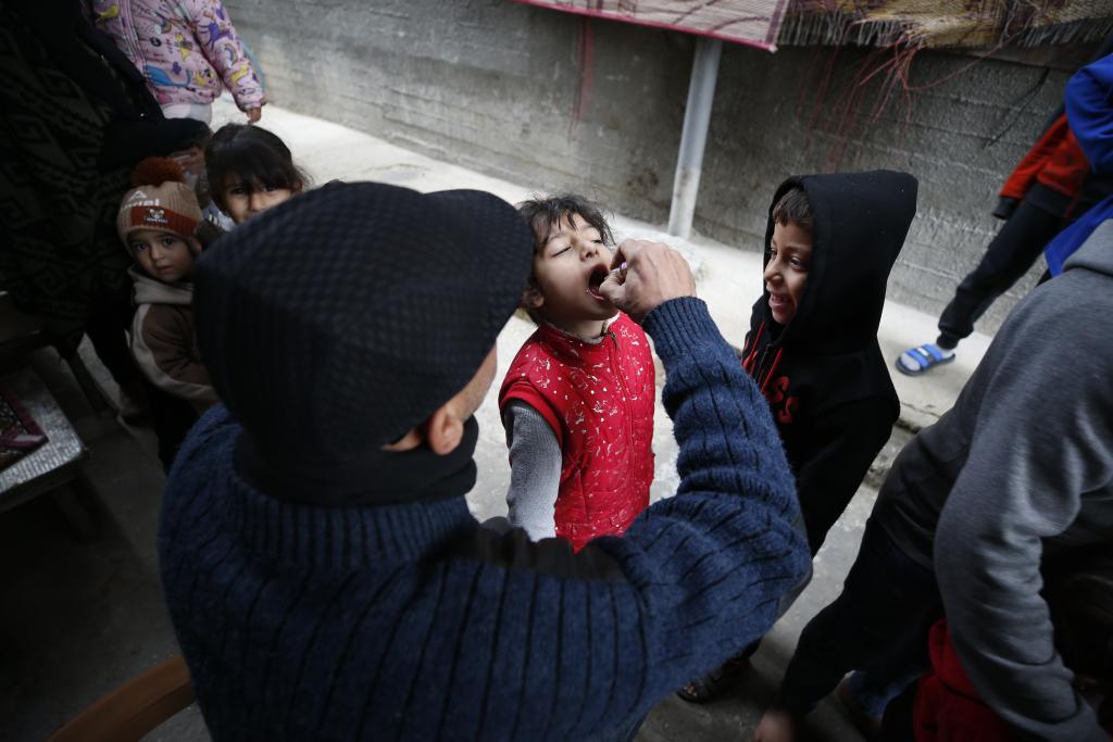 2月22日,工作人员在加沙地带杰巴利耶为巴勒斯坦儿童接种脊髓灰质炎疫苗。新华社发(马哈茂德扎基摄)