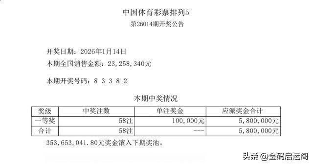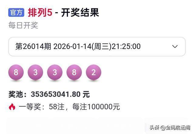 【七星彩+快3彩票一站式平台】(访问:363050.com 领取888U)权威玩法解析、实时开奖数据更新,精选高返奖率正规平台。注册即送购彩金,独家分析工具助您精准投注!168彩票开奖网是彩种最全、开奖最快的专业彩票开奖网站。北京PK10、时时彩、极速赛车、双色球、大乐透、快三、幸运飞艇、双色球预测软件、彩票平台推荐一应俱全!体育彩票排列五第26014期开奖号码揭晓,本期号码为:8、3、3、8、2。全国共中出58注一等奖,每注固定奖金十万元。开奖后,奖池资金继续增长至35.37亿元。