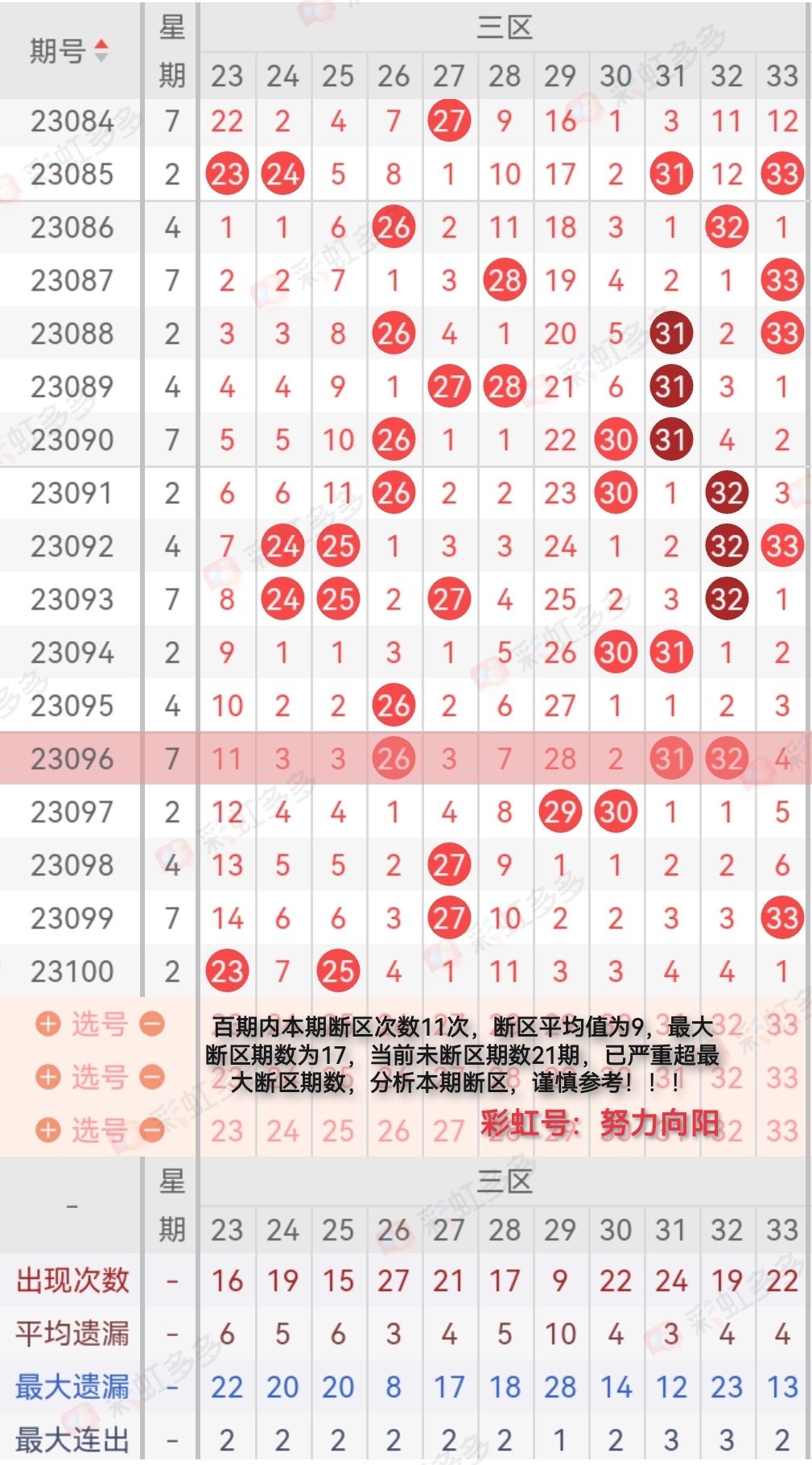 最近五期本区出号大(29-33)中(28)小(23-27)比为:5:0:5百期内本期断区次数11次,断区平均值为9,最大断区期数为17,当前未断区期数21期,已严重超最大断区期数,且百期内统计上期出现号码23至下期断区情况出现一次,上期出现号码25至下期断区情况出现两次,本期接上期出号23.25加之当前断区指数对比分析本期判断为断区。以上分析均为个人观点,仅供参考!