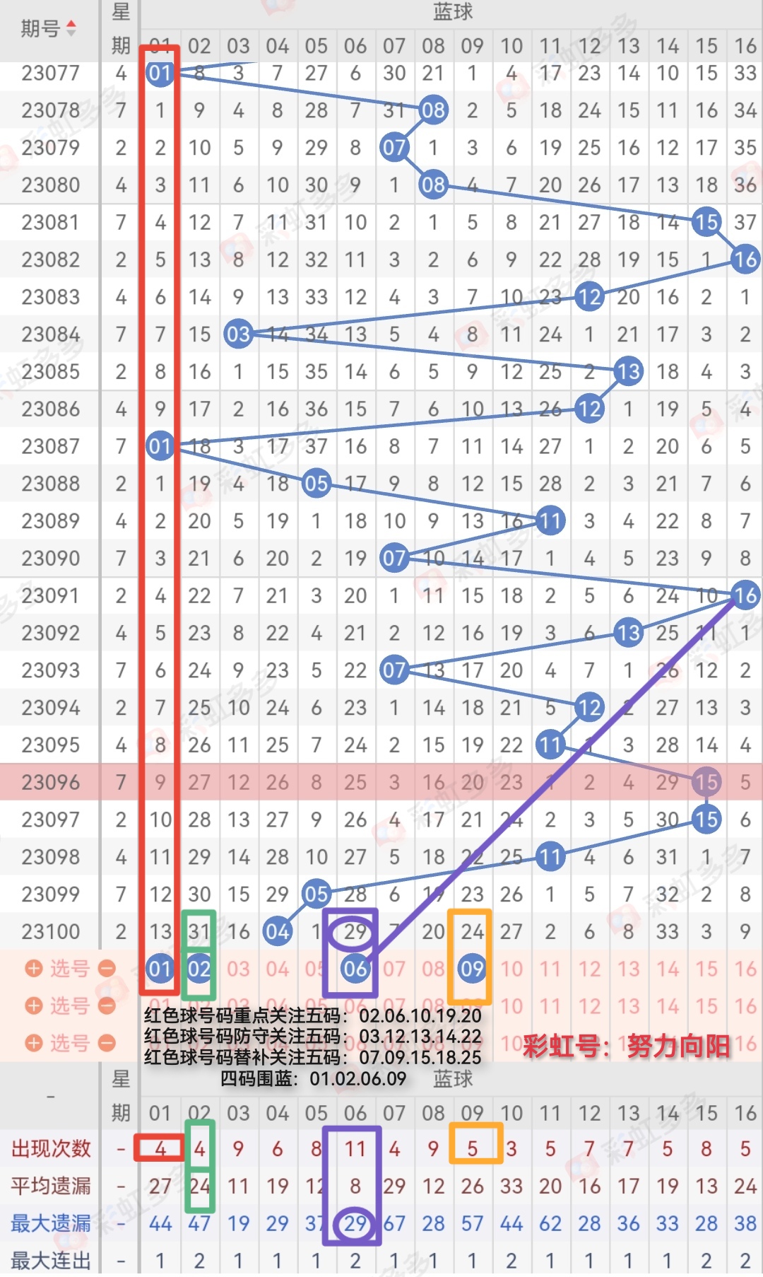 综合本期分析红色球号码及蓝色球号码总结:红色球号码重点关注五码:02.06.10.19.20红色球号码防守关注五码:03.12.13.14.22红色球号码替补关注五码:07.09.15.18.25四码围蓝:01.02.06.09以上分析号码关注选择组合不定,替补关注五码红球不在分析内,依个人观点选择组合。